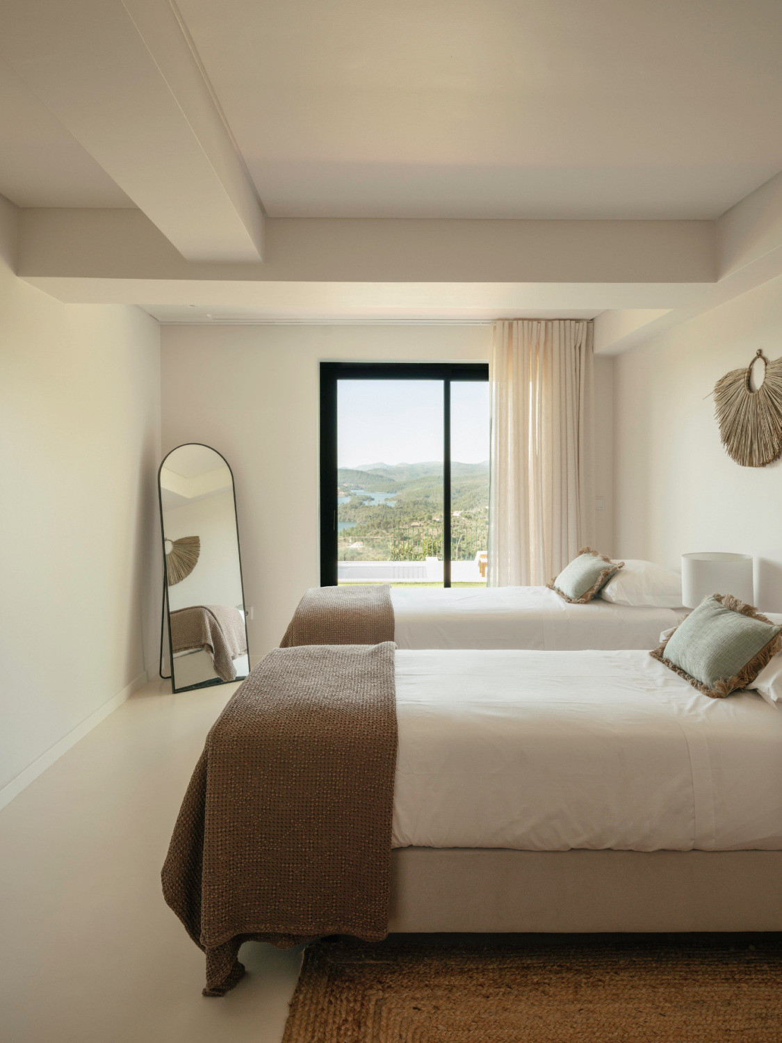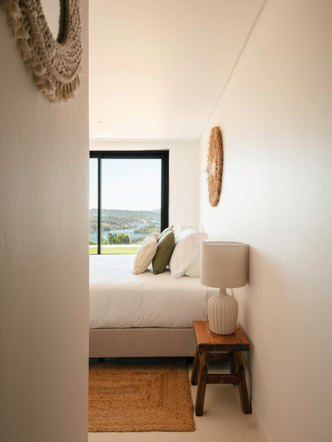 Indoors, the villa welcomes you with its high-ceilinged living spaces, elegantly curated decor, and a grand fireplace perfect for intimate gatherings. Each bedroom offers a peaceful escape, with sweeping views of the countryside.
